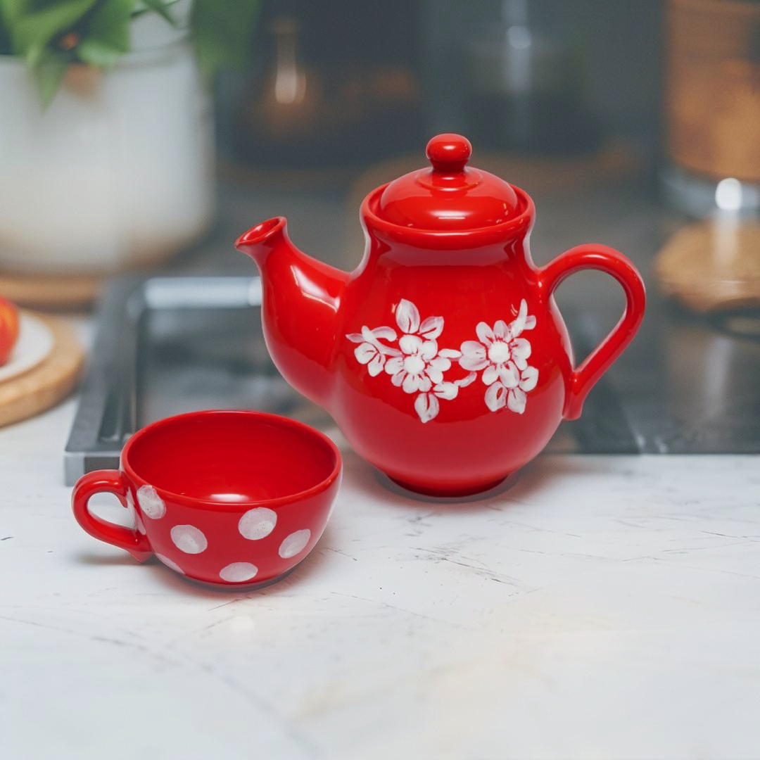 Unikatni keramički čajnik u živopisnoj crvenoj boji sa ručno oslikanim belim cvetovima donosi šarm i toplinu svakom posluženju. Sa visinom od 22 cm (uključujući poklopac), ovaj čajnik je idealan za uživanje u omiljenom napitku – bilo da je u pitanju jutarnji čaj, popodnevni biljni eliksir ili večernja doza opuštanja.